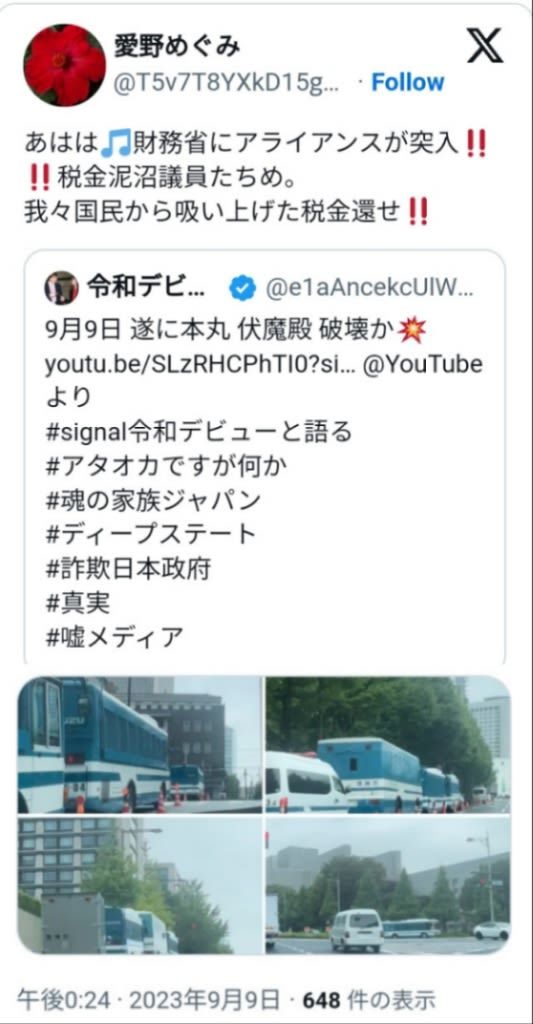 財務省にアライアンスが突入!税金泥棒!政財界!トランプ大統領演説9月9日終了は全ての排除のGOサイン!我々国民から吸い上げた税金還せ!財務省…飯倉地下、伏魔殿!麻布台ヒルズの地下解体!EBSが遅れた理由は人身売買の根深さにあったようで、これら政財界の残党の排除逮捕捕が加速!EBS、世界的ネサラゲサラ発動へゴーシグナルへ進展!9月9日=QQ!2023年9月9日!あはは?財務省にアライアンスが突入‼️‼️税金泥沼議員たちめ。我々国民から吸い上げた税金還せ‼️https://t.co/7VriuUTeeI—愛野めぐみ(@T5v7T8YXkD15gL3)September9,20239/9寅さんの演説終了は全ての2.0排除のGOサイン財務省飯倉地下伏魔殿麻布台ヒルズの地下解体‼️ホテルオオクラ厳重な警備‼️恐らく...財務省にアライアンスが突入!税金泥棒!政財界!トランプ大統領演説9月9日終了は全ての排除のGOサイン!財務省…飯倉地下、伏魔殿!麻布台ヒルズの地下解体!
