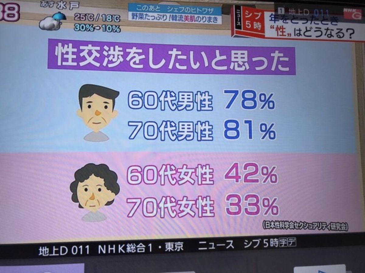 7 匿名さん 18/07/01(日) 11:44 生涯スケベであろう男はジジイになってもスケベだろうから、まあキモいけどわかる。 しかしまさか60、70になったババアまで3〜4割がセックスしたいとか思ってるとは…。