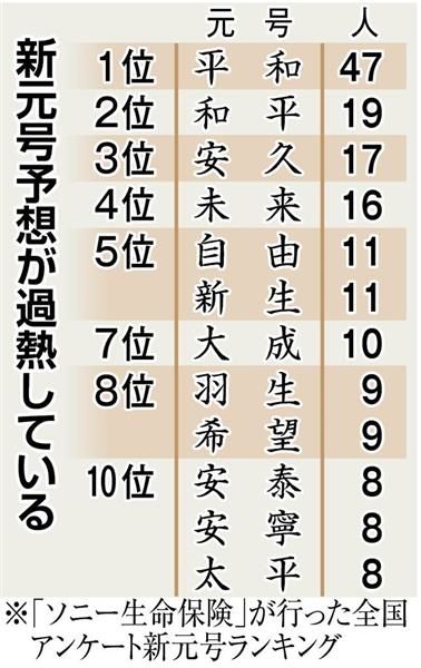 新元号予想を募る企業も出てきた。「ソニー生命保険」(東京)が今年3月、全国の20~28歳の平成生まれ500人と52~59歳の昭和生まれ500人の計千人に新元号を予想してもらったところ、「平和」(47人)「和平」(19人)「安久」(17人)がベスト3に選ばれた。広報担当者は「想像以上に、多くの人が新元号に関心を寄せていると感じた」と驚きを隠さない。新元号は「安久」!? SNSなどで予想合戦白熱 「M・T・S・H」以外、「安」の文字人気