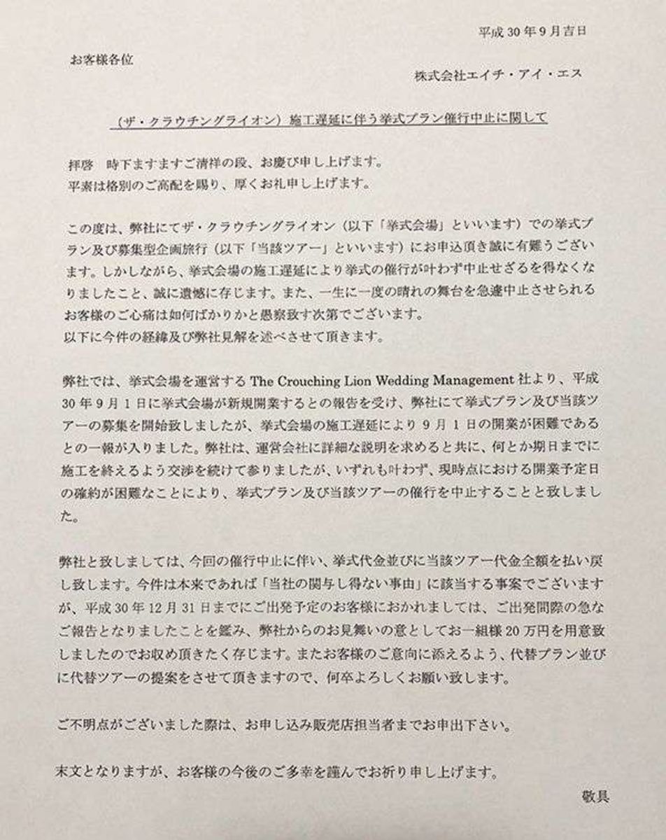 ところが9月4日、HISから耳を疑う知らせが届いた。CLの施工遅れによる式場のキャンセル。なぜもっと早く知らせてくれなかったのか、と抗議するA子さんに対し、HISの担当者は謝罪するのみ。代金返金のうえ補償金20万円を支払うと説明されたが、すでに予定を組んでいる親戚、友人たちの都合はどうなるのか……。A子さんは途方に暮れた。 同プランに申し込んでいた別の男性は、HISから送られてきた報告の手紙に対して憤る。 「そこには〈本来であれば「当社の関与し得ない事由」に該当する事案でございますが〉などと書かれており、謝罪の言葉もありません」H.I.S.ハワイ結婚式“ドタキャン”260件で大トラブル | 文春オンライン