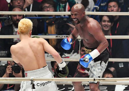 <RIZIN14>◇12月31日◇さいたまスーパーアリーナ ボクシングの元世界5階級制覇王者フロイド・メイウェザー(41=米国)が本気になった。ボクシング・エキシビションマッチで、キックボクシング界の“神童”那須川天心(20)から3度のダウンを奪い、1回2分19秒、TKO勝ちを収めた。那須川のパンチが左頬をかすめた瞬間、本気モードに突入。33連勝の那須川を子ども扱いし、格の違いを見せつけた。 試合開始のゴングが鳴ると、メイウェザーは笑いながら戦い始めた。最初の打ち合いで、那須川の左ストレートが頬をかすめると、顔つきが変わった。右ボディーの後、右フックを那須川の側頭部にたたきこみ、1度目のダウン。さらに、右アッパーで2回目。そして左フックでとどめをさした。 日本マット界に、世界トップの大物が上がり、日本人選手と対戦するのは、ムハマド・アリ対アントニオ猪木戦以来の“歴史的事件”だった。エキシビションながら、容赦なく襲いかかり15発で那須川を沈めた。那須川のパンチも当たったが、次元が違った。 試合後はまた、へらへら笑いに戻った。予定になかった会見を開き、上機嫌で15分間話し続けた。「那須川は若いライオンだ。成長する余地はたくさんある。この試合は記録には残らない。これからも頑張ってほしい」と惨敗した相手を持ち上げた。 世紀の一戦とも言われた戦いは、公式戦でないにもかかわらず、ルール問題で試合当日までもめた。最後は、RIZIN側の説得を受け入れ、メイウェザーが「ハンディ」として10オンス、那須川が8オンスのグローブを着けることを承諾。今回の来日で、初めてメイウェザーが折れた。それでも会場に遅れてくると、いったん巻いた那須川のバンデージをもう1度巻き直させるなど、ぎりぎりまでやりたい放題だった。 那須川も、試合が決まるとボクシングの本格トレーニングのため渡米。メイウェザーと同じラスベガスの元3階級制覇王者ホルヘ・リナレスのジムで特訓した。それでも子どもの頃から那須川を見ているテッペンジムの那須川弘幸会長は「本当は怖くてたまらないんですよ。メイウェザーが本気になったら、天心が壊されるかもしれないじゃないですか」と、試合前に苦しい胸の内を明かした。その心配が当たった形だ。 メイウェザーは試合の後の会見を終えると、米ラスベガスへ帰るために羽田空港へ直行した。嵐のようにRIZINを席巻したメイウェザーは、そのニックネーム「マネー」の言葉通り、わずか50時間あまりで約10億円のファイトマネーを稼ぎ出した。にやにやメイウェザー、天心子供扱いで10億円荒稼ぎ(日刊スポーツ) - Yahoo!ニュース
