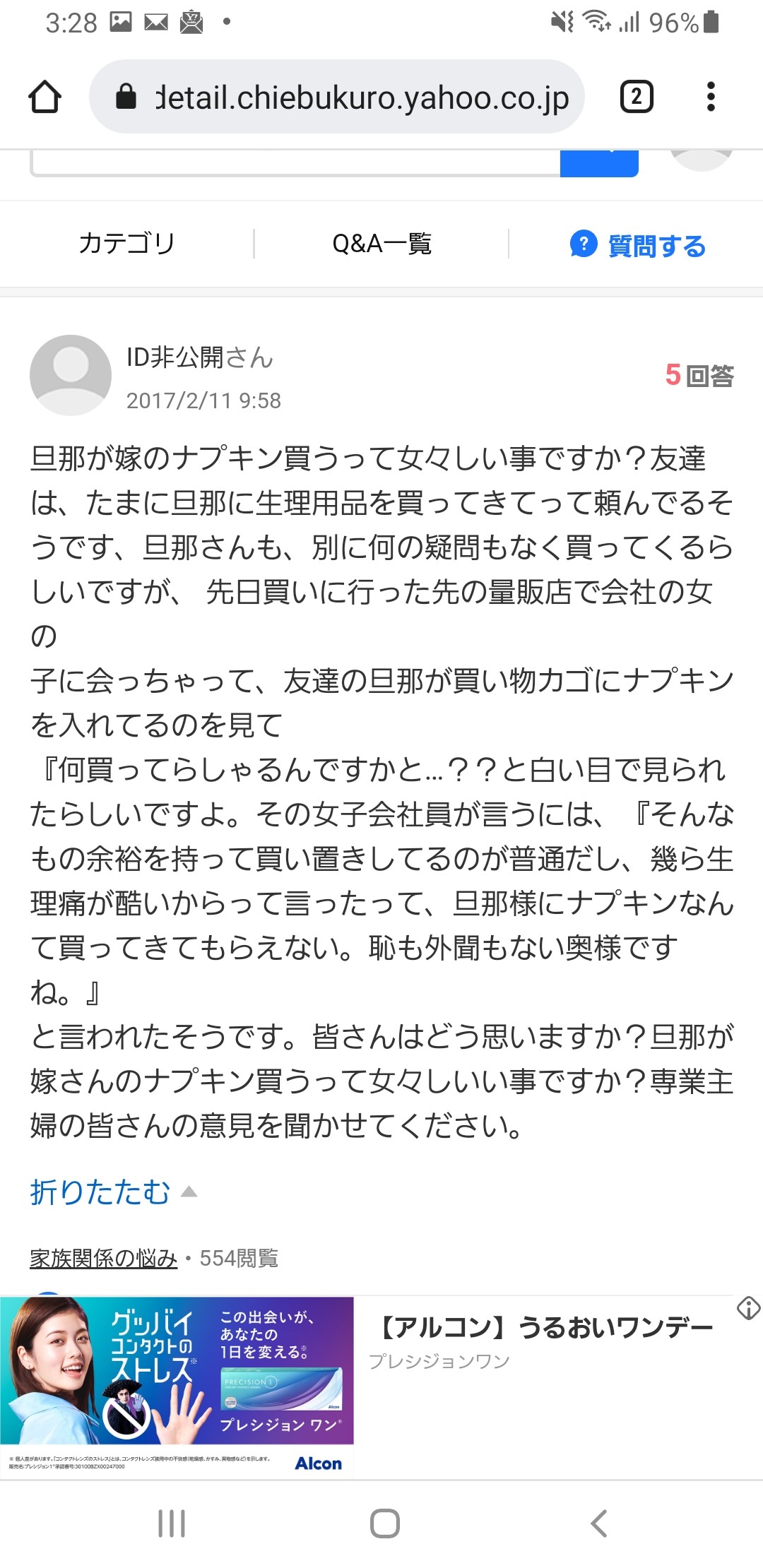 154 匿名さん 21/12/04(土) 03:50 >>141 無神経、同じ女として受け入れることができない、同意します。 覗く気がなくても、生理用品のパッケージって一目見て、生理用品ってはっきり分かりやすいから。 入院中に買ってきたことあるって男もいるけど、事故とか突然入院するパターンってそうそうないし、大体は前もって分かってる入院のはすだけどね。 買いに行って貰う行為も、普通ではないと思います。