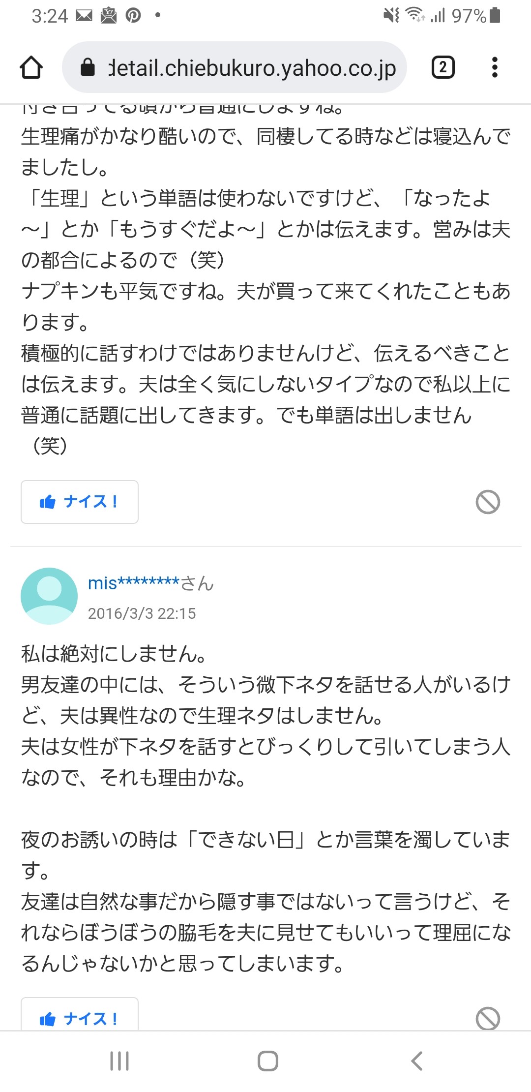 149 匿名さん 21/12/04(土) 01:28 >>124 彼氏や旦那さんに、知っててもらいたいとか、変わってるね。 何の為に? 気持ち悪い。 下品だね。 普通の女は、知ってほしいなんて思わないので、多くの女は話さないですよ。 娘を持つ父親には、知っててもらいたいとか、生理を知らない人がいるとは思えないけど。 お金を渡せば、生理用品も小遣いから買うから何も問題ないよね。