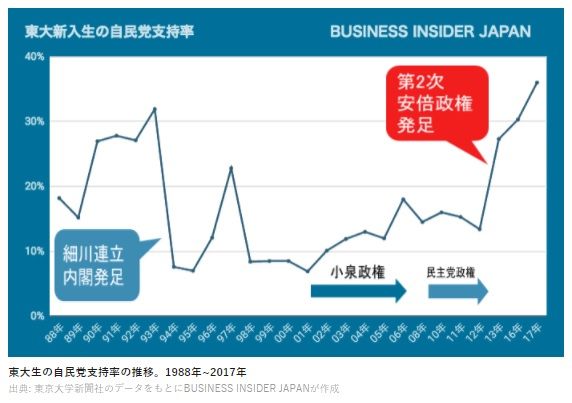安陪総理はリベラル(革新)ではないだろうか? 最低賃金引上げ、賃上げ要請、働き方改革、幼児教育無償化、私立高校の無償化、奨学金の拡充、自由貿易の推進、金融緩和、大きい政府 これら は全てリベラルよりの政策です。 実際に生活保護受給者数は5年間で13%減少し、低所得層の賃金は上昇しています。 東大生の自民党支持率の推移 1988年~2017年