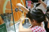 「みかん蛇口」のジュースは1杯350円。カップを購入し、蛇口から自分で注ぐ。ジュースには、季節によって旬のかんきつ類が使われる。愛媛では蛇口からみかんジュースが出る-都市伝説は本当だった!? 松山空港に「みかん蛇口」 初の常設