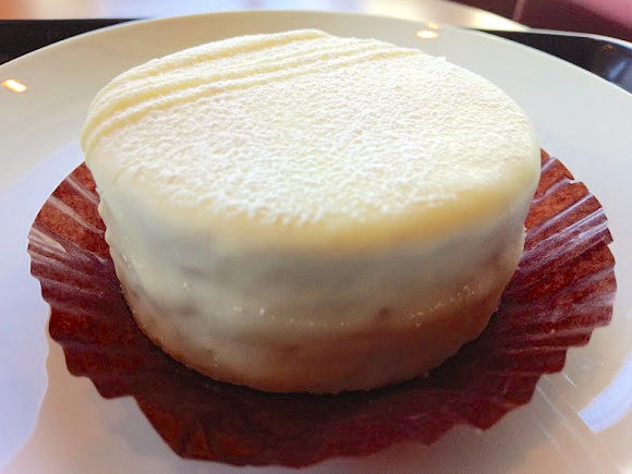 まぶしいくらいに真っ白な「ホワイトザッハトルテ」(税抜420円)は、ホールケーキを小さくしたようなまあるい形。表面はホワイトチョコレートでコーティングされていて、パウダーシュガーが粉雪みたいです♪