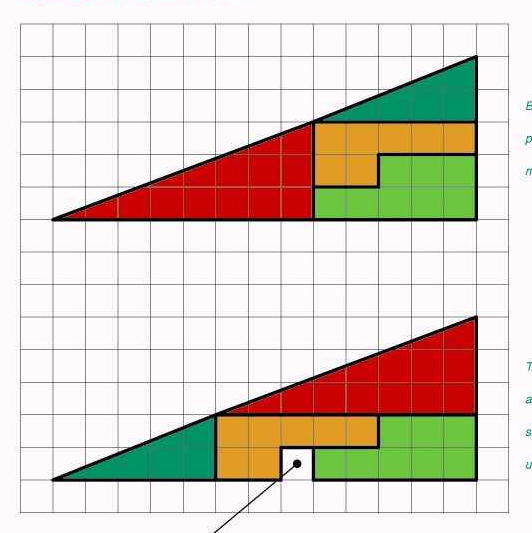 ポイントは上下の図形の斜辺は、どちらも直線ではないのです。 赤の三角形の左頂角は、傾斜が8分の3あります。これは角度にして約20度です。また青の三角形は傾斜が5分の2で、角度で約21.5です。 上の図形は斜辺が少しへこみ、下の図形の斜辺は少...