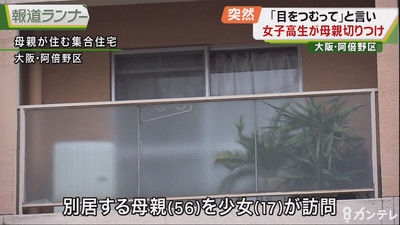 17歳女子高校生 包丁で母を刺し逮捕 6日午前8時半ごろ、大阪市阿倍野区で別居する母親(56)のもとに高校生で17歳の少女が訪れました。 少女は母親に対し「目をつむって欲しい」と言い、母親が応じて目をつむったところ、刃渡りおよそ17センチの文化包丁で突然切り付けたということです。 母親はとっさに包丁をかわしましたが、指や背中、胸などを切り付けられ軽傷です。 以下、全文を読む