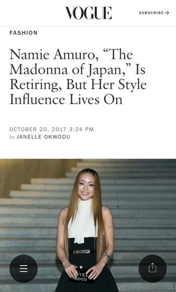 そんな書き出しで紹介された記事では、10代から歌手としてのキャリアをスタートし、代表曲「CAN YOU CELEBRATE?」が20年以上にわたりヒットし続けていることや、ヒップホップを取り入れた楽曲で音楽業界を常にリードしてきたことなどを伝えている。あの「VOGUE」に安室ちゃんが! 「日本のマドンナ」音楽、ファッション、生き方、25年間の足跡紹介(琉球新報) - Yahoo!ニュース