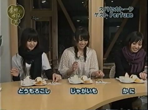 とうもろこしです。じゃがいもです。かにです。3人合わせて、Perfumeです。