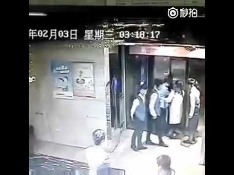 中国人、エレベーターに乗り遅れ渾身のカンフーキック!かっこ良くドアを蹴り破り落下 Man falls into shaft after kicking elevator door open