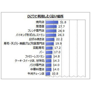 飲食店・レジャー施設をひとりで利用することに抵抗感がある人は62.0%(2014年64.8%)。男女別では、男性5割強、女性7割強と女性の方が高く、特に女性高年代層で高い傾向がみられたという。 ひとりで利用したくない場所、1位「焼肉店」 ひとりで利用したくない理由は、「他の人と利用した方が楽しい」「ひとりだと利用しづらい雰囲気」が各4~5割となった。