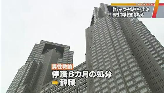 東京都教育委員会は15日、教え子だった女子高校生とレンタルルームに宿泊した33歳の中学校の男性教諭を停職6カ月の処分としました。これを受けて男性教諭は当日付で辞職しました。 都教委によりますと2017年11月、東京23区内の公立中学校に勤務する33歳の男性教諭は、都内の飲食店で以前勤めていた高校の女
