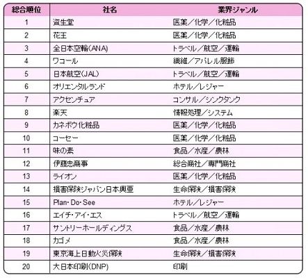 2019年卒の就活解禁から、1か月が経とうとしている。楽天が運営する就活情報サイト「みん就」は3月20日、2019年卒予定の女子学生を対象に、就職人気企業ランキングを発表した。 調査には、サイトに登録する女子大学生・大学院生のうち、ウェブ上のアンケートや就活イベントの参加者など2083人が回答。みん就が独自に選んだ600社のノミネート企業のうち、「男女関係なく活躍できそう」「結婚・出産後の働きやすさ」「プライベートの充実」「女性社員の魅力」など複数の項目から、企業を上げてもらい、サイト独自の算出方法で順位づけした。 ITコンサルは激務と思われがちだが、最近は「女性活躍」企業として表彰実績も 1位から20位までの一覧。画像はプレスリリースより。 みん就では昨年、2018年卒の学生を対象にした人気企業ランキングを発表し、女子学生から人気だった企業のランキングも出している。ただ、結婚・出産後の働きやすさなど、女性が気にしやすい項目に特化した調査は今回が初めてとなる。 1位は化粧品メーカーの資生堂。化粧品メーカーは、2位の花王、9位のカネボウ化粧品、10位のコーセーなど、トップ10に4社がランクインした。 また、3位の全日本空輸、5位の日本航空、16位のエイチ・アイ・エスなど、旅行関連の企業も人気だ。6位オリエンタルランドや15位のPlan・Do・Seeのように、レジャーやブライダル関連企業も注目されている。 このほか、ワコール(4位)、楽天(8位)、アクセンチュア(7位)など、18年卒の人気企業ランキングには見られなかった企業が目立った。 アクセンチュアはITコンサル業界ということもあり激務のイメージがあるが、昨年、日経WOMANが主催する「女性が活躍する会社BEST100」で「ワークライフバランス度部門」の4位に入ったり、2016年に日本生産性本部が主催した「女性活躍パワーアップ大賞」で優秀賞に選出されたりしている。こうした受賞経歴が、女子学生に働きやすいイメージを与えているのかもしれない。