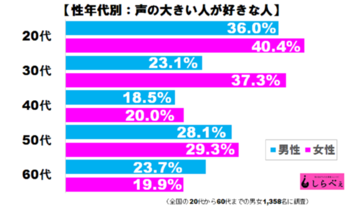 ■性年代別に見ると傾向が 性年代別に見ると、20代女性が40.4%と割合が高め。 男性も36.0%と高めで、若者が好む傾向があるよう。ハキハキしててかっこいい! 「声の大きい人は好かれる」は本当か
