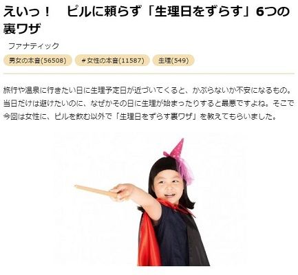 マイナビウーマン3月29日、同サイトの「えいっ! ピルを飲まずに生理日を遅らせる6つの裏ワザ」の記事を削除したと発表した。記事は2016年11月に掲載されたもので、ピルを飲まずに生理を遅らせる方法として「風邪薬を飲む」「体調を崩す」などと記載。同サイトは記事に「誤解を招く表現」があったとし「内容が不適切と判断し、該当記事を削除させていただきました」と説明している。記事を作成したのは外部の編集プロダクション 昨年炎上した有休記事も制作 問題になった記事(現在は削除済み)記事では、22~34歳の女性115人を対象にしたアンケートを元に、ピルを飲まずに生理日を遅らせる方法として、「ストレスをためる」「ダイエットをする」 「体調を崩す」「食事のバランスを崩す」 「豆乳を飲む」「風邪薬を飲む」の6つを紹介。記事のまとめには「くれぐれも無茶なことはし過ぎないようしましょう」と記載していたが、風邪でないのに風邪薬を飲んだり、極端なダイエットを「生理を遅らせる裏ワザ」として紹介しておきながら、読者にそんな注意を促すのは道理が通らないだろう。ブロガーのイケダハヤトさんも29日のブログでこの記事を取り上げ、「第二のWELQになる予感」と言及していた。当該記事は編集プロダクションの「ファナティック」が作成。マイナビウーマンでは2017年1月にも、「意味わかんない!『社会人としてありえない』有休取得理由7つ!」という記事を掲載し、「有休の理由なんてなんでもいいだろ」と批判を浴びて削除していたが、この有休記事もファナティックが制作したものだった。マイナビウーマン編集部では今回の騒動について「本件を重く受け止め、他の記事についても不適切な内容がないかの確認を併せて進めます」と発表している。