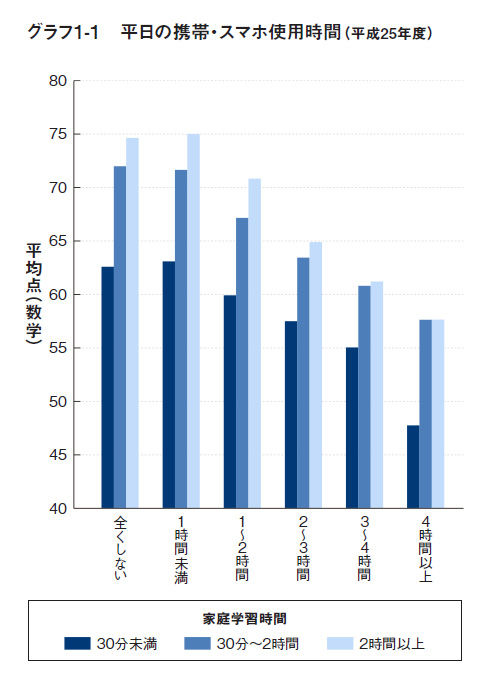 スマホを使うと2時間の学習効果が消える!? スマホが子どもたちの学力を破壊している。それも、想像されているよりも遥かに悪い影響が学習に及ぼされている。この衝撃の事実に最初に気付いたのは、平成25年度に標準学力検査と生活・学習状況調査の結果を目にした瞬間でした。 グラフ1-1をご覧ください。平成25年度仙台市標準学力検査、仙台市生活・学習状況調査の結果です。仙台市立中学校に通う全生徒2万2390名のデータを解析したものです。 縦軸は数学のテストの平均点です。横軸では、生徒たちが平日に携帯電話やスマートフォンをどのくらい使っているのかをアンケート調査し、全く使用しない群から、4時間以上使う群まで、6群に分けてそれぞれで平均点を計算しました。 アンケート調査での実際の質問のしかたは、「ふだん(月曜から金曜日)、1日当たりどれくらいの時間、携帯電話(スマートフォンもふくむ)でメールやネットゲームをしたり、インターネットを見たりしていますか」というものになります。 さらに、私たちは、生徒たちを平日の自宅での勉強時間の長さごとに、毎日2時間以上勉強する群、30分から2時間勉強する群、ほとんど勉強しない30分未満の群の3群に分けて解析をしました。 解説をご覧いただく前に、ぜひとも、ご自身でこのグラフから何が読み取れるのかをお考えいただければと思います。"スマホが学力を破壊する"これだけの根拠 3時間触ると2時間の勉強がムダに | プレジデントオンライン