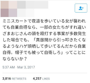 「ミニスカート履いて夜道を歩いてレ○プされたら自業自得」