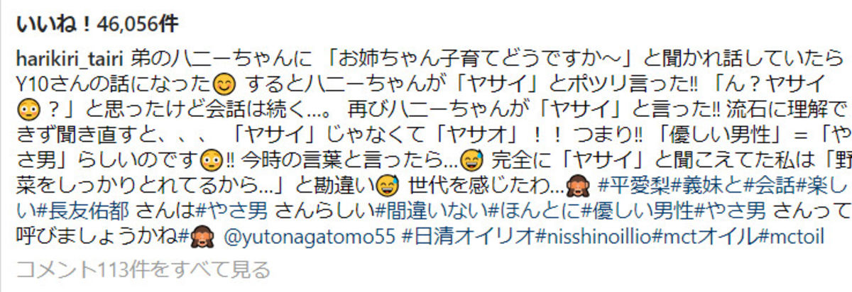 タレントの平愛梨が自身のインスタグラムに投稿した内容が話題になっている。 弟のハニーちゃんに 「お姉ちゃん子育てどうですか〜」と聞かれ話していたらY10さんの話になった? するとハニーちゃんが「ヤサイ」とポツリ言った‼︎ 「ん?ヤサイ??」と思ったけど会話は続く…。 再びハニーちゃんが「ヤサイ」と言った‼︎ 流石に理解...
