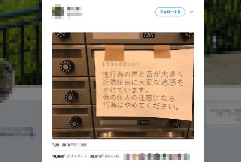 「性行為の声と音が大きく近隣住民に大変な迷惑をかけています。他の住民の迷惑になる行為はやめてください」。こんなことが書かれた紙が、メールボックス(郵便受け)に、目立つように張りつけられている画像が...