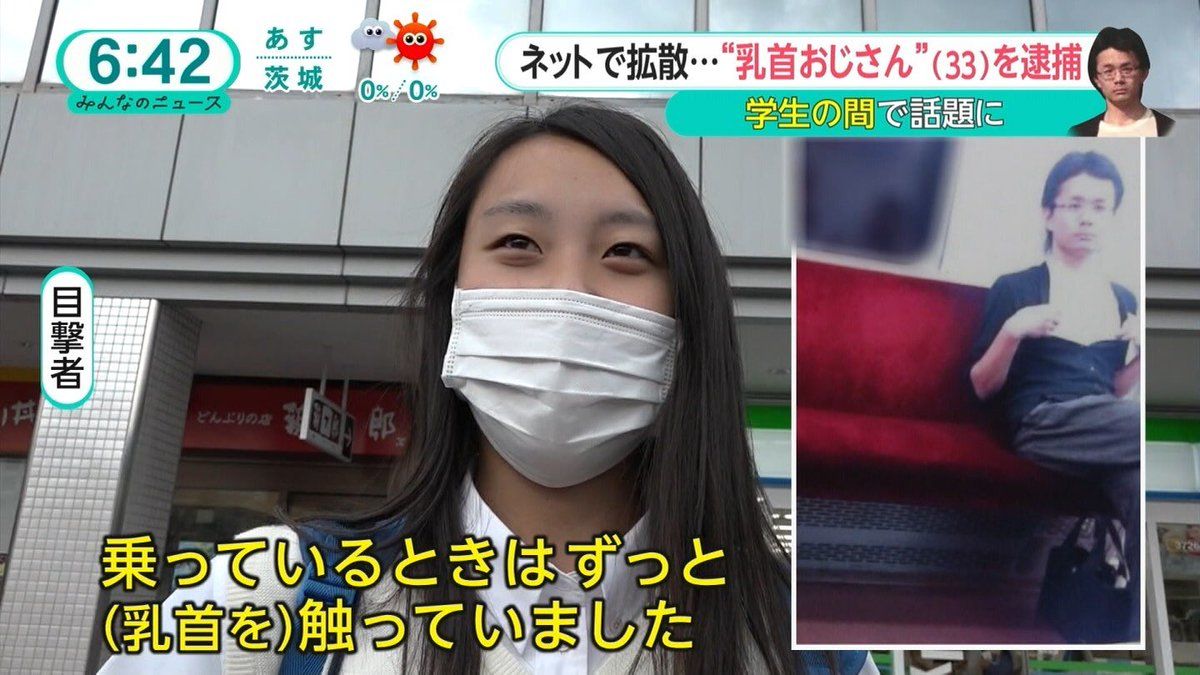 元栗東市職員を逮捕 女性の前で胸を露出 電車内で自分の胸を触る様子を見せつけたとして、京都府警木津署は4日、府迷惑行為防止条例違反(卑わいな行為)などの疑いで、元滋賀県栗東市職員で派遣社員の男(35)=京都府精華町=を逮捕した。 男は数年前、女性を見ながら自分の胸を触る様子を撮影されてインターネット上に投稿され、「乳首おじさん」として話題となっていた。 平成28年には電車内で下半身を露出したとして、公然わいせつの疑いで逮捕(罰金の略式命令)されている。 続きはこちら