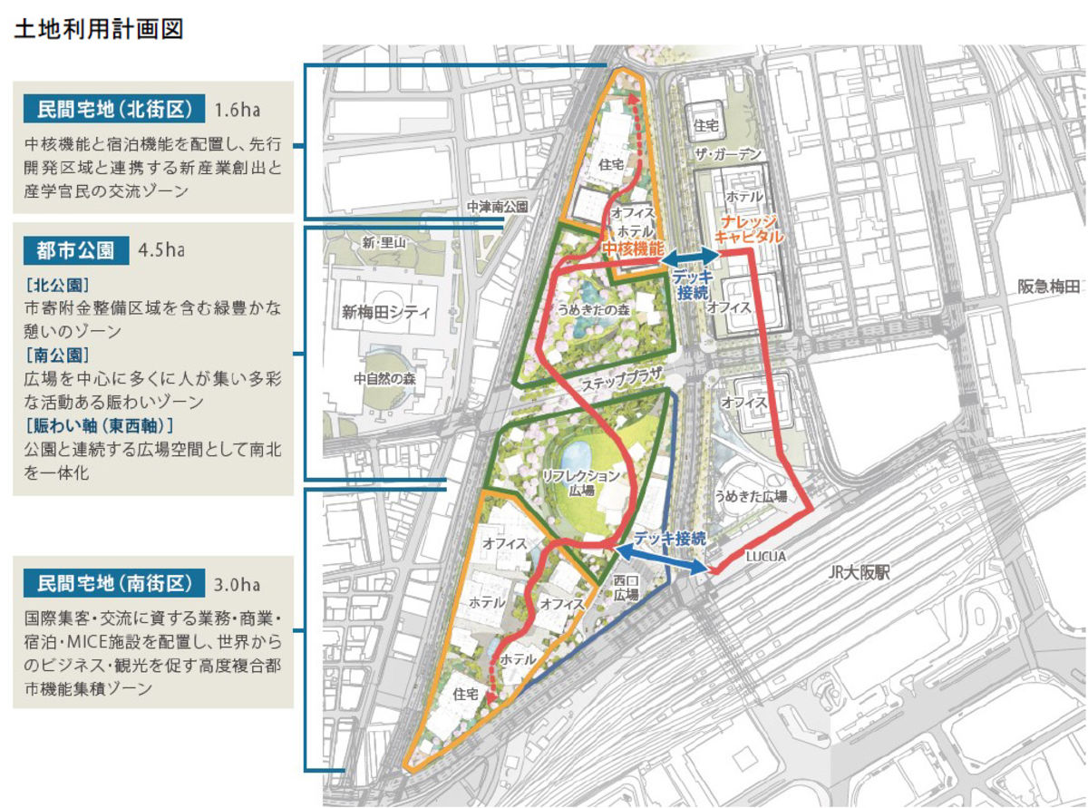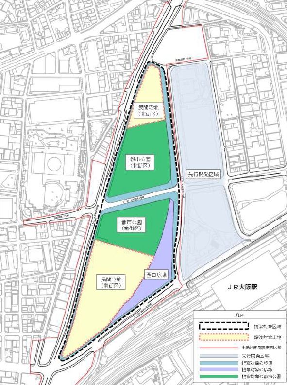 対象区域は、JR大阪駅から徒歩7分の北街区が1万0726平方m、同4分の南街区が3万5429平方mの計4万6155平方m。