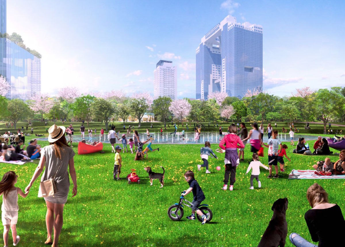 中央部分(4・5ha)の都市公園を挟んで、南街区(3・0ha)にはオフィス、ホテル、商業施設、都市型スパ、MICE施設、イノベーション施設、分譲住宅、駐車場を整備する。