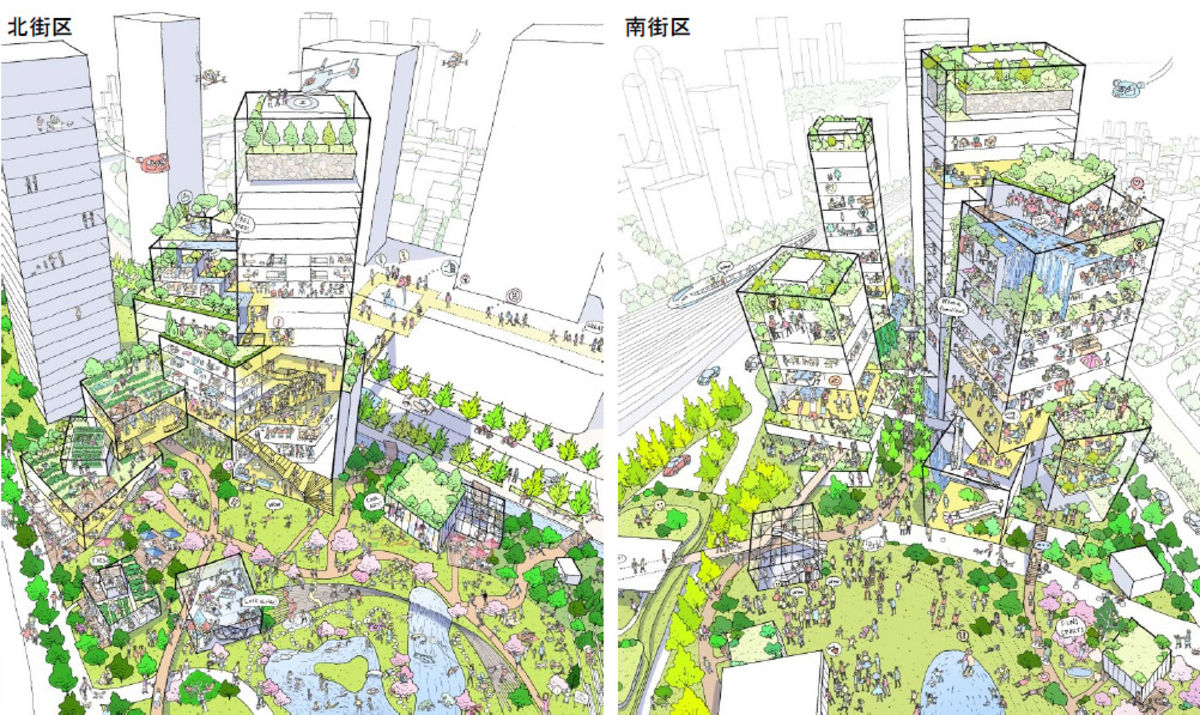 北街区(1・6ha)にはホテル、イノベーション施設、プラットフォーム施設、オフィス、商業施設、分譲住宅、駐車場が入る。建物はS一部RC・SRC造地下2階地上28階建て(高さ150m)と、RC一部S造地下2階地上47階建て(高さ176m)。