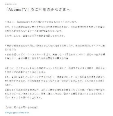 「AbemaTV」装い偽の出演依頼、金銭や肉体関係強要……運営元が注意喚起| インターネットテレビ「AbemaTV」運営元のAbemaTVはこのほど、同社に無関係の第三者が、同社の社員や関係者を装ってSNSを通じてダイレクトメッセージを送り、実在しない番組の出演依頼を持ち掛けて金銭を要求したり肉体関係を強要するなどの行為が確認されているとし、注意を呼び掛けた。