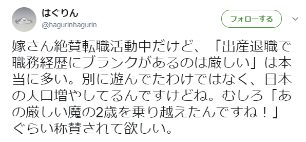 【ネットの声】 ・分かります。本当に多いですよね。私の場合は経歴にブランクなしですが、「子どもがいると長時間働けないでしょ」といわれ、何度も面接を落とされました。 ・私は面接で「子育てでつちかわれた忍耐力があり、つらくても仕事を投げ出すことなく達成する力があります」といい、再就職に成功しました!子育てをする母親ならではの強みを訴えてみることをオススメします。 ・採用担当の者です。小さいお子さんのいる人は就業時間を短縮せざるを得なかったり、何らかの事態が起きた際に残業できなかったりすることが多く…。採用は相対評価で行うので、なかなか難しいのが実情です。子育てが理由で採用を断られた妻 夫がつぶやいた『本音』に、賛否両論