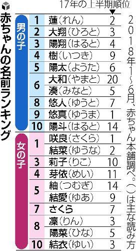 ベビー用品販売「赤ちゃん本舗」(大阪市)がまとめた2018年1~6月に誕生した赤ちゃんの名前ランキングによると、男の子は「蓮(れん)」、女の子は「咲良(さくら)」と「結菜(ゆうな)」がトップだった。