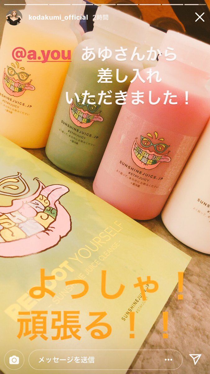 倖田は、自身のInstagramアカウントのストーリーに動画を公開した。その中で「絶賛リハーサル中なんですが、やばいニュースです」として「大先輩あゆさんから」「今スタジオでばったり会いまして、なんとわざわざ私たちに差し入れを買ってきてくれましたー」と、浜崎と遭遇し、色とりどりのドリンクを差し入れしてもらったと報告した。
