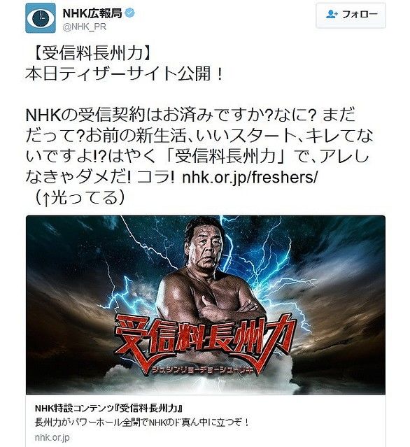 NHKがTwitterなどで長州力を起用した告知をして、批判が殺到している。「受信料長州力」という文字や、長州が男性をねじ伏せる写真を掲載。ネットからは、「ヤクザのみかじめ料かなんかかよ」との声が上がった