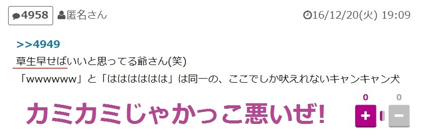 4889 匿名さん 16/12/20(火) 19:26 >>4958 敏速な反応.対応に驚愕しております。しかし反応の速さは、バレバレの自演行為を肯定しているものと推測されます。 今後の益々のご活躍を祈念してご挨拶に代えさせて頂きます。 さようならww 。゚(゚^Д^゚)゚。ギャハハ八八ノヽノヽノヽノ \ / \/ \