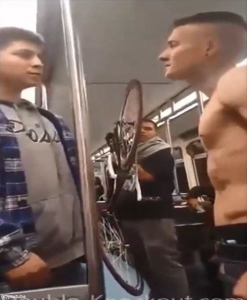 アメリカの地下鉄車内で、他の乗客たちに絡む上半身裸の男。