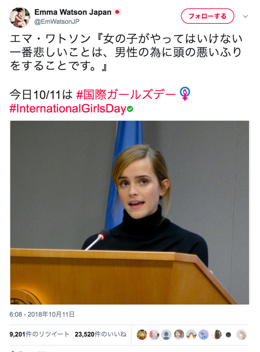 「女の子がやってはいけない一番悲しいことは」エマ・ワトソンさんの言葉に男女から共感の声