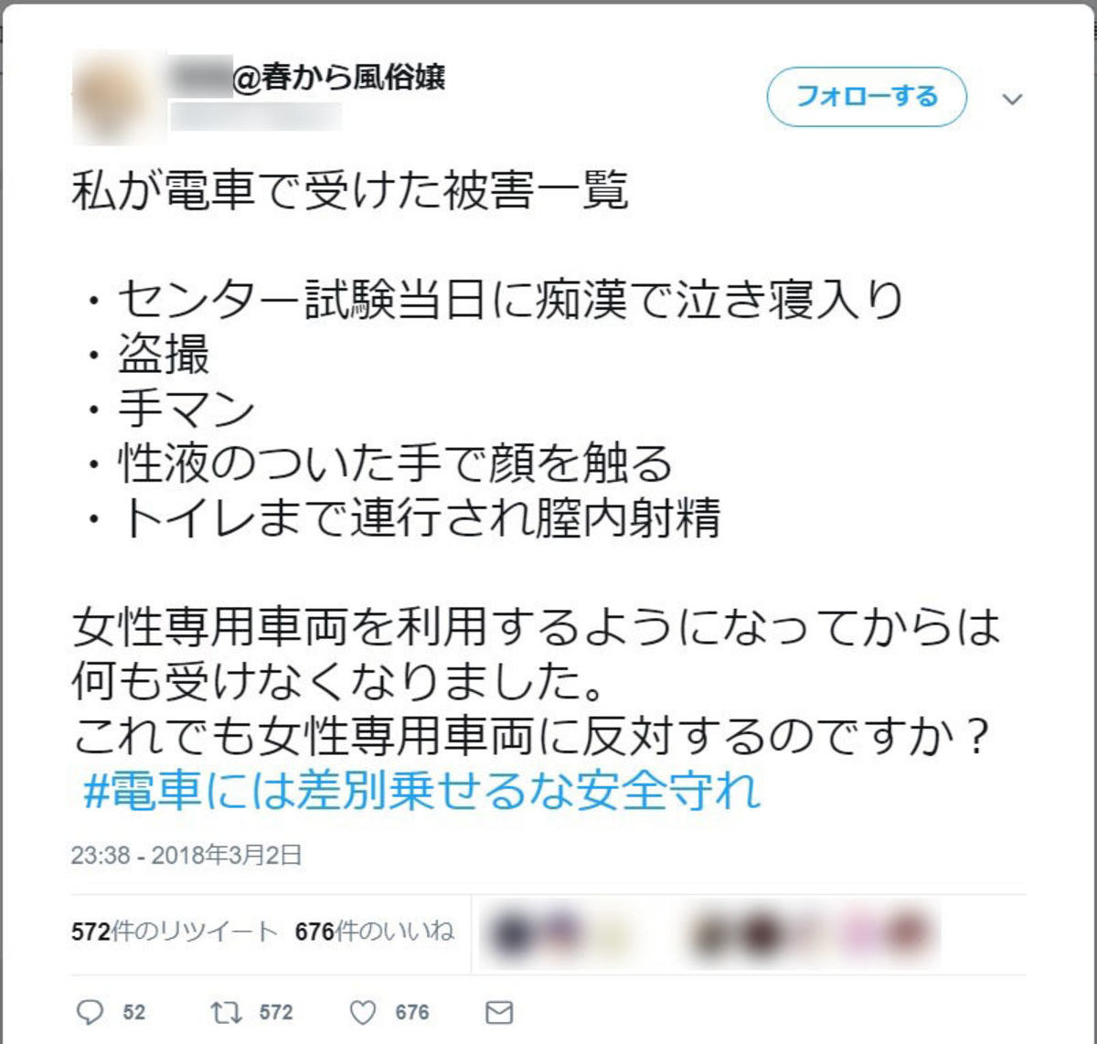 Twitterで女性専用車両に賛成してる女性見るけど一部に強烈なフェミがいて女性から見ても本当に怖い