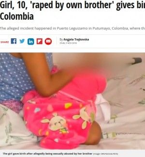 兄にレいプされた10歳少女、男児を出産(画像は『Mirror 2018年11月5日付「Girl, 10, ‘raped by own brother’ gives birth to boy in Colombia」(Image:CEN/Noticias RCN)』のスクリーンショット) 未成年者が性的暴行の被害者となるニュースを耳にするたび居たたまれない気持ちになるが、加害者が家族の一員であった時にはなお更やりきれない。このほどコロンビアで、10歳少女が実兄に性的暴行を受けた末に出産した。『Mirror』『The Sun』などが伝えている。 コロンビアのプトゥマヨにあるプエルト・レグイサモという地域で、両親と一緒に住んでいた10歳少女(名は公表されず)が、実の兄に性的暴行を受け、妊娠。11月1日に男児を出産した。 フロレンシアの病院にて帝王切開で出産した少女は、誕生した男児ともに元気にしているそうだ。少女の出産後、カミロ・ディアズ病院長は「未成年者が家族の一員、つまり兄に暴行を受けたうえでの妊娠であると警察からの情報を受けている」と地元メディアに明かしている。 また同メディアによると、両親は妹に性的暴行を働いた息子を警察に通報したくなかったようだ。しかし今回、警察では児童虐待事件として捜査を続けているという。実兄に性的暴行を受けた10歳少女、帝王切開で男児出産(コロンビア)