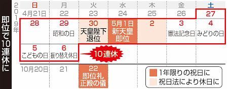 皇太子さまが新天皇に即位される来年5月1日と、新天皇即位を公に示す「即位礼正殿の儀」が行われる同10月22日を来年に限り祝日とする法律が8日未明の参院本会議で、賛成多数で可決、成立した。祝日法の規定により、来年4月27日から5月6日まで10連休となる。 国民の祝賀ムードを高めるのが狙い。祝日法は、祝日に挟まれた日を休日にすると定めており、連休谷間の5月1日が祝日になると、4月30日と5月2日が休日となる。「10連休」法が成立=新天皇即位日を「祝日」に:時事ドットコム