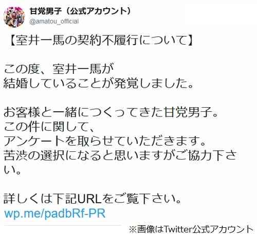 同サイトでは「関係者より『甘党男子メンバーである室井一馬がマネジメント契約中に一般女性と婚姻している』との情報提供を受け、至急本人に確認したところ、事実であるという事が判明しました」と発表。「これはアイドルとしてファンを裏切る行為であり、重大な契約違反にあたる為、マネジメント契約を解除、また甘党男子からの脱退を検討し、他メンバー含む事務所関係者内にて緊急で協議いたしました」とした。 グループでは結果として、室井を支えてきたファンの意見によって進退を決めることに決定。甘党男子公式Twitterにて、アンケート機能を用いた投票を実施する。アンケート期間は12月10日24時~17日24時となっている。男性アイドルが結婚発覚、進退を投票で決定 - モデルプレス