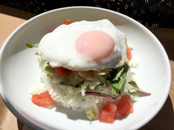 そしてタコライス。こちらは、ひき肉・チーズ・トマト・サルサソース・チーズ・目玉焼きのバランスが絶妙! しっかりとした旨味がありつつもサッパリ風味で、野菜の食感も最高である。決してド派手なウマさではないものの、いつでも食べたくなるような “素っ気なさ” が最大の魅力なのだ。