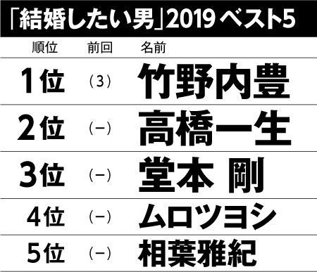 週刊文春版「結婚したい男」1位は竹野内豊、2位は高橋一生、3位はKinKi Kids堂本剛|ニフティニュース
