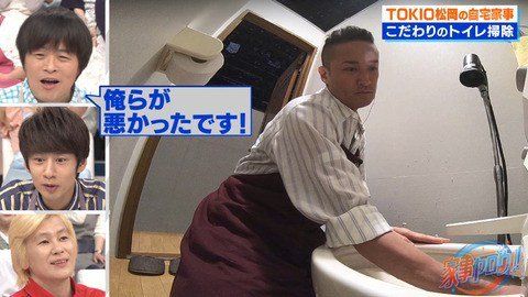 手袋も無しでトイレットペーパーを手に蓋や便座、便器の上部を拭きとり、拭き終わったペーパーをトイレに放り込む。すると、その勢いで便器に手を突っ込み、素手のままで便器の中を洗いはじめたのだ。 丁寧に便器内を手で洗い流し、最後は除菌クリーナーで細部を磨き上げる。全てを素手で行い一礼して、その場を後にした。 「舐めるぐらい綺麗にしろって子供の時に言われた」と素手掃除の理由を明かした松岡に、掃除を振った中丸は「ごめんなさい。そんな強いこだわりをもってると思わなかった」と反省を覗かせた。TOKIO松岡昌宏の「こだわりのトイレ掃除」姿に悲鳴あがる 「男らしいというか衝撃的」
