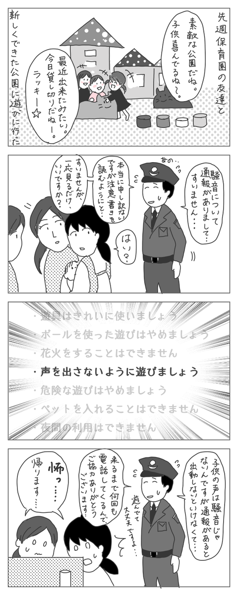 石垣島の日記が途切れていますが、先日衝撃的なことがあったので久しぶりにアップ。なんと…公園で通報されてしまいました( ゚д゚) 先週の日曜日、保育園のお友達2人とうちの子で自転車に乗って最近新しくできたキレイな公園に遊びに行ったんです。キレイな公園なのに人がい