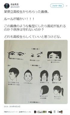 ある県立高校の頭髪に関する校則を紹介する画像がツイッター上で出回り、ネット上では疑問視する声が相次いでいる。髪や眉に関するルールを写した画像で、「サイドを短くする」「横髪が出ている」などと違反の髪型が定められているのが確認できる。投稿者「ルールが細かい!!!」発端は、2019年4月24日夜、合法先生(@barbeejill3)というツイッターユーザーが投稿した写真。