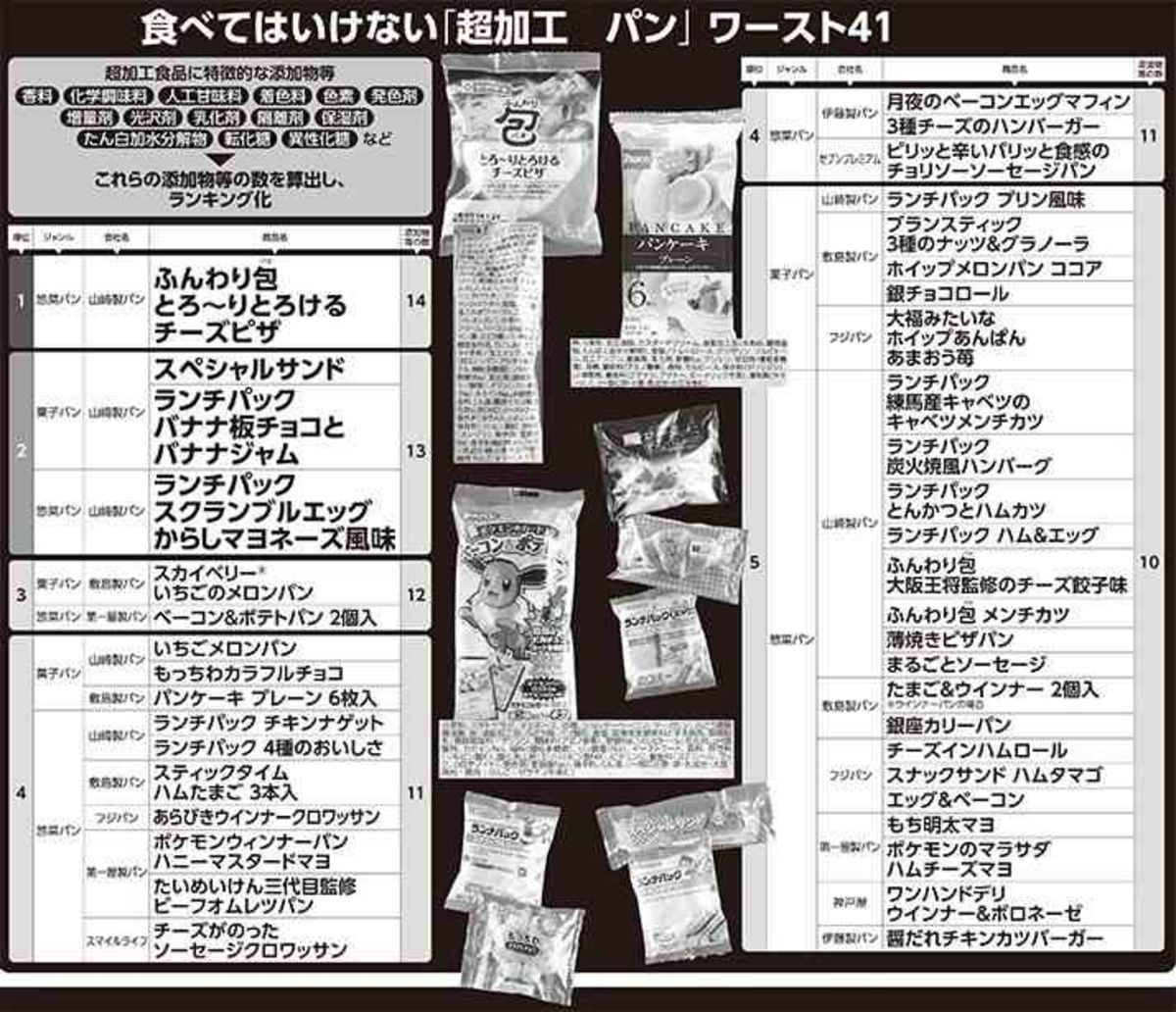 掲載したリストをご覧いただきたい。これはいずれも本誌がスーパーの売り場で実際に確認した商品で、「超加工用添加物」が多い順にワーストランキングの形式でまとめたものである。ランチパックも危ない! 「食べてはいけない超加工パン」実名ランキング | デイリー新潮