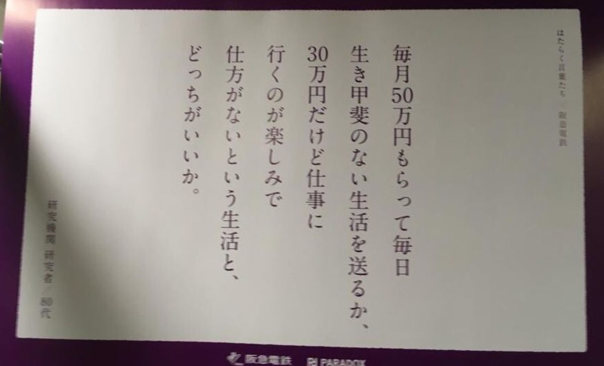 阪急電鉄の車両内に掲示された「中吊り」をめぐって、ネット上では批判の声が集まっている。さまざまな業界で働く人々の言葉を紹介。あしらわれている文言に対し、「あれは誰が作ってんの?大昔の人?」「時代の違う感性だな...」など疑問の声が相次いだ。