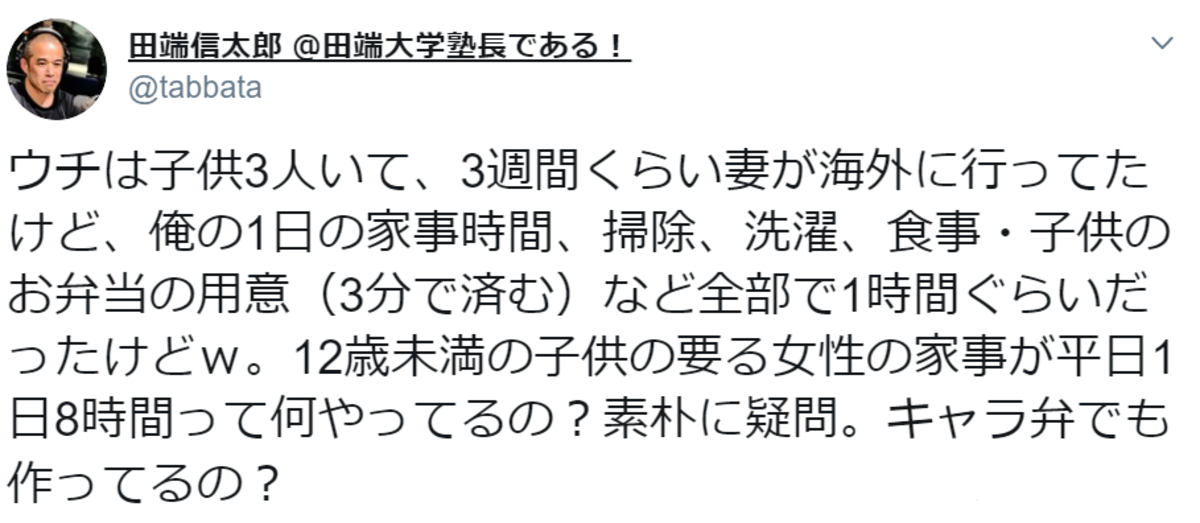 ウチは子供3人いて、3週間くらい妻が海外に行ってたけど、俺の1日の家事時間、掃除、洗濯、食事・子供のお弁当の用意(3分で済む)など全部で1時間ぐらいだったけどw。12歳未満の子供の要る女性の家事が平日1日8時間って何やってるの?素朴に疑問。キャラ弁でも作ってるの? ■ネットの反応 ・嫌味とかじゃなしに、3分でお弁当用意は動画で見たい! ・お弁当の支度3分…?ご飯詰めて冷ましてたら3分過ぎると思うけど! ・要領悪いからどういう内訳で家事したら1時間で終わるのか教えて欲しい ・田端氏が、1日8時間もw、と引用するNHKの調査は家事ではなく育児の時間。起きてる時間100%カウントされる人も含めての時間だから。いくら何でも女性を馬鹿にしすぎ。乳児の育児時間なんて自分でやる限り誰がどうやっても短くならんし、それを短くしてたらただの虐待。 ・お金稼ぎが上手くて、合理主義なんだろうけど、普通に生活してる人に叩かないと、自分凄いでしょアピールできない「凄く心の貧しいヤツ」 そして、コイツの家の時計と体内時計は、狂ってる。 ・こういうの、想像力がないって言うんだよね。たった3週間、最低限中の最低限をやっただけでこのドヤ感と女性への煽り。頭悪いよねぇ。 ・これも定番の主婦叩き。実際に1日1時間程度で家事を止めたら家の中が確実に汚くなるし秩序が無くなる。掃除洗濯しか家事に上げられないのも実際にやったことがないから。家事はそれだけじゃないよ。 ※田端信太郎 ……株式会社ZOZOの執行役員 コミュニケーションデザイン室長であり、オンラインサロン「田端大学」の塾長。ZOZO田端信太郎さん 「家事忙しい言ってる主婦はキャラ弁でも作ってるの?w」→大炎上 | まとめまとめ