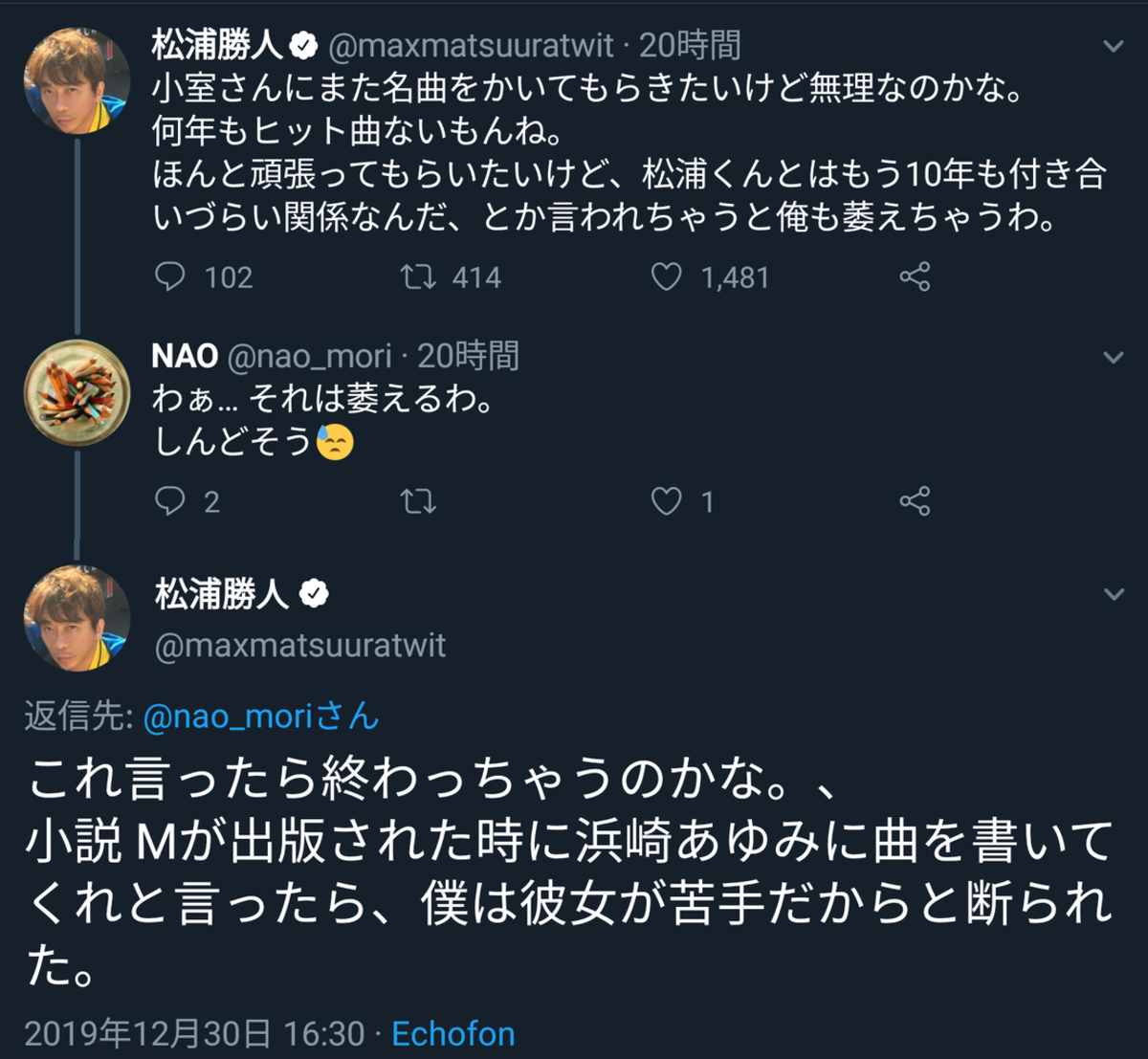 ’19年10月からTwitterを休んでいたエイベックスの松浦勝人会長が、年末年始に活発化。しかも、所属タレントである沢尻エリカの逮捕からエイベックスの躍進を支えた小室哲哉に関することなど爆弾発言連発