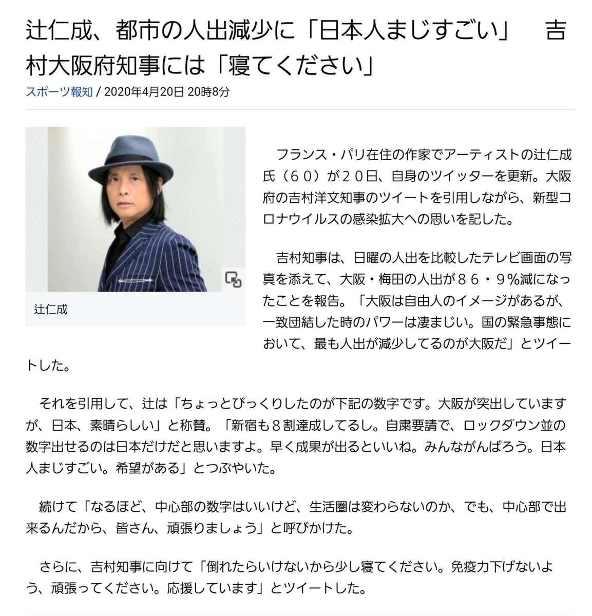 辻仁成、都市の人出減少に「日本人まじすごい」 吉村大阪府知事には「寝てください」